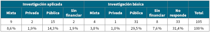 Por otra parte, cuando se les pregunta a los investigadores españoles que trabajan en los ámbitos universitarios a propósito de la financiación se puede decir (tabla 9) que 1 de cada 3 (31,4 %) no responde, dato que es relevante por la falta de información sobre la forma de sufragar investigaciones. No obstante, con independencia de que se trate de investigación básica o aplicada, un 43,8 % de los encuestados afirma que la financiación de sus investigaciones es pública y solo el 2,9 % dice que es privada.