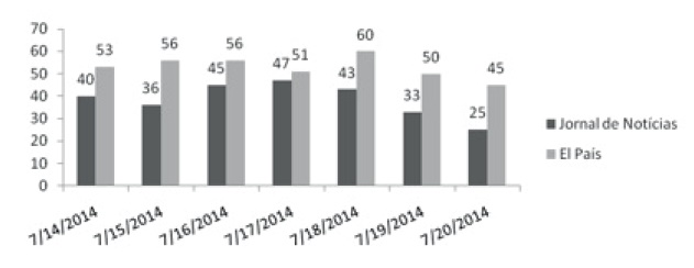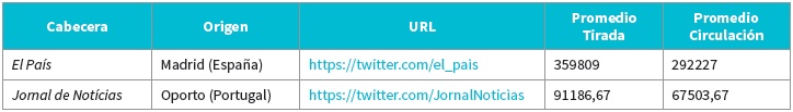 Aunque el promedio de tirada y de difusión de los periódicos en papel es superior en El País, 3,94 veces más de tirada y 4,32 veces más de difusión que Jornal de Notícias —debido, quizá, a una cuestión de diferencia poblacional entre países, puesto que España tiene 4,51 veces más habitantes que Portugal5—, en el caso de los cibermedios, esta diferencia es todavía mucho más manifiesta: el diario El País posee 23,8 veces más seguidores que Jornal de Notícias.