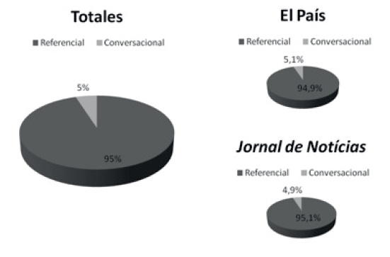 Respecto a las tipologías de carácter conversacional, las más utilizadas son: (1) “Invita a ver la información con enlace interno”, con 14 tuits (2,3 % del total de tuits), seguida de (2) “Anuncia entrevista online e invita a participar (con enlace interno)”, con cinco tuits (0,8 % del total de tuits). En este caso es El Pais el que utiliza más veces la primera opción (12 veces de las 14) y Jornal de Noticias se decanta más por anunciar e invitar a seguir la cobertura (con enlace interno) y por realizar un saludo o despedida (sin enlace), con cuatro veces cada opción.
