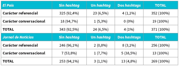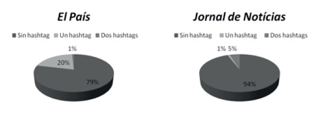 Siguiendo con los elementos analizados, tal y como se ha explicado con anterioridad, los hashtags permiten etiquetar términos para facilitar su seguimiento. El uso de etiquetas por parte de los cibermedios es bastante escaso. Ambos periódicos publican la mayoría de los tuits sin ningún término etiquetado (92,5 % en el caso de El Pais y 94,1 % en Jornal de Noticias). El resto de resultados es poco significativo. Sin embargo, si se tiene en cuenta que mediante el uso de los hashtags un tema concreto puede convertirse en Trending Topic, sí resulta significativo el hecho de que los medios analizados obvien dicho elemento.