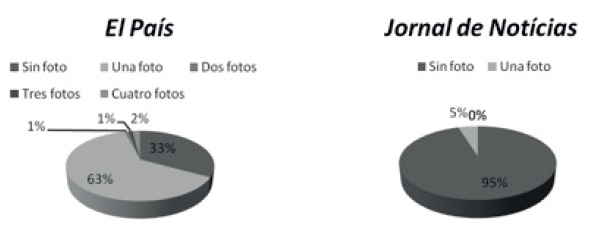En cambio, el 95,2 % de los tuits publicados por Jornal de Noticias, lo que corresponde a 256 mensajes, no presenta ninguna fotografía. Y tan solo 13 (4,8 %) contienen una imagen. No se ha encontrado ningún tuit con más de dos fotografías.