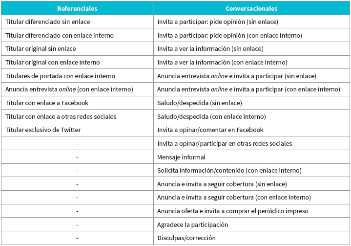 En cuanto a la tipología de los tuits, en el caso de los referenciales, se ha utilizado la nomenclatura “titular original” para indicar los titulares idénticos tanto en Twitter como en la web del medio, mientras que en el “titular diferenciado” se percata la utilización de palabras distintas, modificando la construcción del titular publicado originalmente en el cibermedio. En la tabla 1, se observan todas las tipologías de tuits, tanto referenciales como conversacionales.