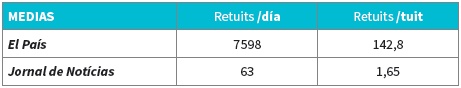 Respecto a los retuits realizados por los internautas, la diferencia entre ellos es muy elevada. Frente a la media de 7 598 retuits al día o la media de 142,8 retuits por tuit de El Pais, se encuentra la exigua media de 63 retuits al día o la media de 1,65 retuits por tuit de Jornal de Noticias.