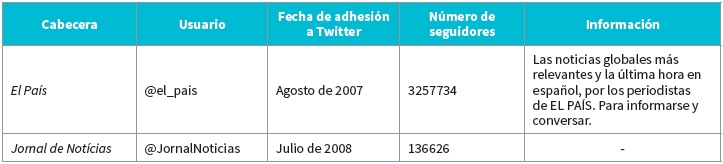 De las dos cabeceras de la muestra, el diario español fue el primero en unirse a la práctica del microblogging, en agosto de 2007, un año después de la creación de Twitter. Once meses más tarde, en julio de 2008, creó su cuenta Jornal de Noticias.