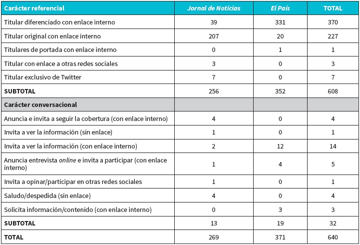 Los tipos de mensajes más frecuentes en Twitter corresponden a las siguientes tipologías pertenecientes a la categoría referencial: (1) “Titular diferenciado con enlace interno”, con un total de 370 tuits (60,8 % del total de tuits), y (2) “Titular original con enlace interno”, con 227 tuits (37,3 % del total de tuits). Cabe destacar que el (1) es el más utilizado por El Pais, con 331 tuits (94 % de sus tuits pertenecen a esta categoría), y el (2) por Jornal de Noticias, con 207 tuits (80,8 % sobre su muestra). La tipología (2) consiste, por tanto, en una mera repetición del contenido publicado en la web del medio, mientras que la (1) deriva de una reelaboración del titular original con el fin de ofrecer al usuario de Twitter un contenido diferenciado.