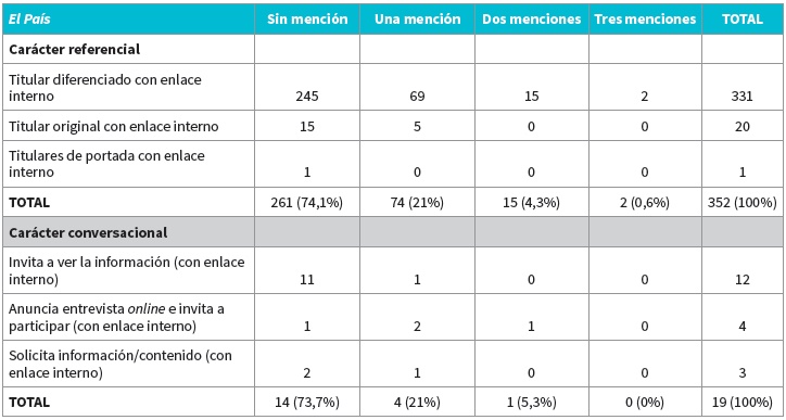 Como se ha comentado anteriormente, Jornal de Notícias no realiza menciones en sus tuits. No se ha encontrado ningún ejemplo en toda su muestra. En cambio, El País sí utiliza este elemento, pero de una manera moderada. Como se puede ver en la tabla 5, aparecen más menciones en los tuits de carácter referencial, siendo el más habitual dentro de la tipología “Titular diferenciado con enlace interno”, con 69 tuits con una mención, 15 con dos y dos tuis, dispuestos a continuación, con hasta tres menciones: