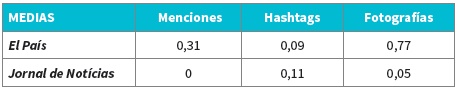 En definitiva, los datos apuntan el laxo uso que ambos cibermedios tienen de menciones y hashtags. El Pais utiliza en mayor medida las fotografías con una media de 0,77 por tuit. Por su parte, los datos marcan a Jornal de Noticias como el medio que más usa hashtags (0,11) y destacan la nula utilización de menciones por parte de este diario.
