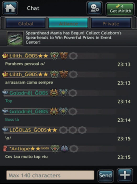 Naquele momento havia na Gods muito interesse e disposição dos oficiais e regentes em proporcionar o crescimento dos seus membros e, com isso, da própria aliança. Percebia como um momento expansivo no jogo. A alegação para a quase obrigação de aceitar o convite para os grupos no WhatsApp se assentava na dificuldade de explicar certas questões sem o recurso de imagens e áudios —portanto, uma justificativa pedagógica—. Por todas as dificuldades de evolução que eu já vinha experimentando sozinha e por, a cada dia, perceber mais e mais detalhes difíceis de compreender, entendi que, se não aceitasse o convite, talvez dois anos depois eu não chegasse a dominar nem metade dos conhecimentos e habilidades que possuo no game atualmente.