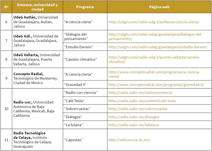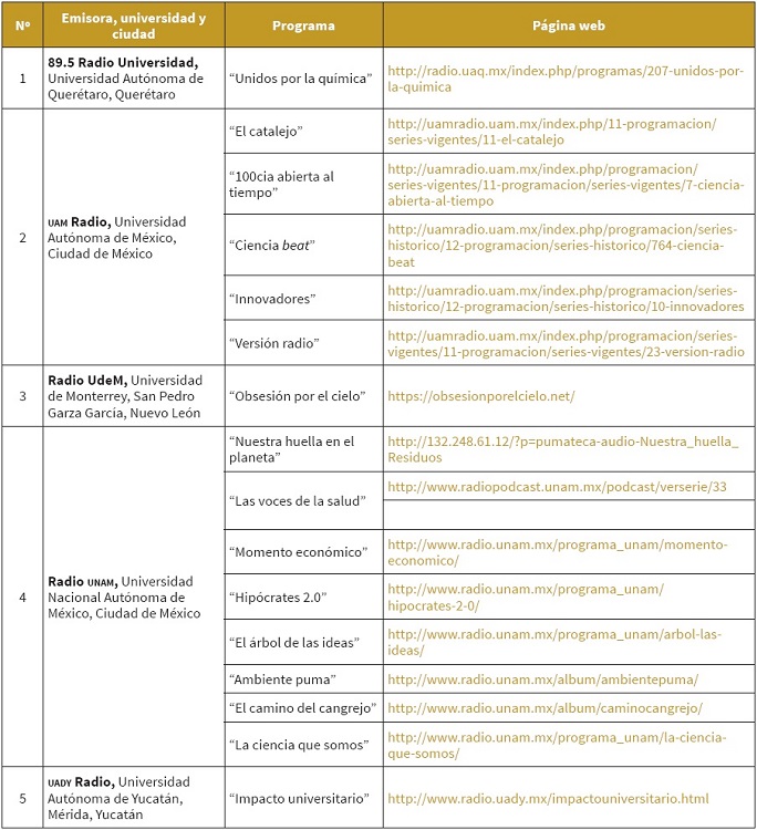 En un estudio previo, efectuado en 2015, se observaba que eran 23 las radios mexicanas que reportaban 74 diferentes producciones en sus cartas programáticas sin tomar en cuenta los espacios informativos donde se incluyen notas cortas, lo que significa un promedio de 1,85 programas por emisora. Las emisoras con mayor producción de programas de temas científicos eran Radio Universidad Autónoma de Sinaloa con 12 productos y la Radio de la Universidad de Ciencias y Artes de Chiapas con 10; sin embargo, de ese total solamente 11 instituciones mantenían disponibles en su página web estas producciones para ser escuchadas a demanda (Vázquez Guerrero, Martín Pena & Parejo, 2015).