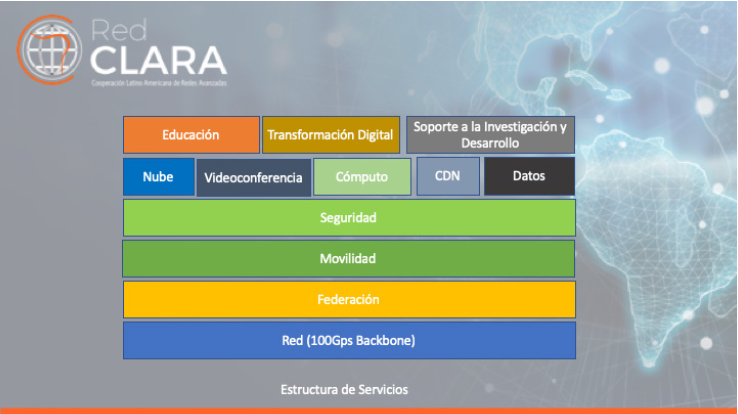 En REdclaRa4 hemos propuesto una arquitectura de servicios que creemos caracteriza el conjunto de productos y servicios que, en función del nivel de desarrollo y madurez de cada red académica, está a disposición de su comunidad de docentes e investigadores (ver figura 1.). Esta arquitectura de servicios permite integrar a los miembros de las redes a nivel global, al usar como primer componente la conectividad física y los servicios de red, y, en un siguiente nivel, los servicios de federación, de movilidad, de seguridad, de nube, de videoconferencia, de cómputo, de redes de contenido y de datos.