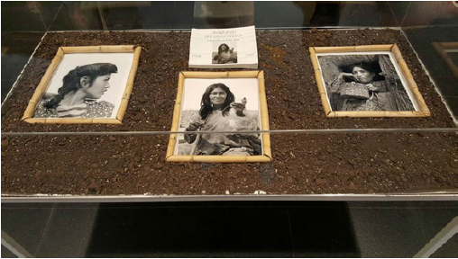 Las tres imágenes aparecen enmarcadas con bordes de caña, ubicadas una al lado de la otra en la misma línea de posición, salvo la del centro que se ubica unos centímetros más abajo para dar lugar al libro que se encuentra en el centro de la composición, en el margen superior. Pero lo singular de este montaje es que las fotos no están colgadas sobre una pared para ser vistas de manera vertical, sino que aparecen sobre un fondo de tierra dentro de una vitrina transparente de formato horizontal, de modo que el espectador es invitado a observar el montaje desde arriba. El fondo de tierra pareciera aquí remitir a la naturaleza y a la ecuación: indígena —pureza tan característica de los registros pretéritos—.