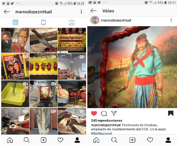 En el caso de la muestra del cck, Marcos López creó una serie de contenidos bajo el hashtag #sernacional, publicados en su cuenta @marcoslopezvirtual. En el momento de la exposición (agosto de 2016), la cuenta tenía alrededor de 6 mil seguidores y en junio de 2019 superó los 26 mil. Lo interesante es que los contenidos no solo se configuraron a partir fotos de la exposición que podían verse entre 2016 y 2017 en sala, sino que construyeron narrativas especialmente pensadas y creadas para Instagram que expandieron los límites del marco de la sala que resguardaba la muestra, en tanto macro-historia o contenido principal expandido en la red. Estos contenidos implicaron imágenes fijas directas con epígrafes o descripciones que focalizaban en aspectos de lo exhibido y audiovisuales que funcionaron como avances previos a la inauguración en sala y spots que invitaban a visitar el proyecto. En su estructura, estos videos se presentaban como remakes de adelantos televisivos con predominancia de la estética del videoclip.