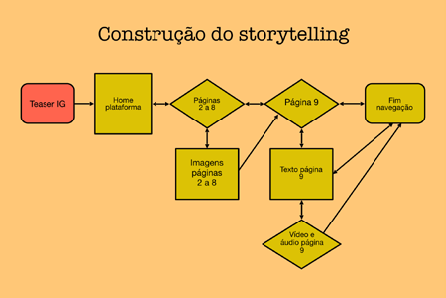 O desenvolvimento do experimento Prismas de Marrakech se deu a partir da conceituação apresentada neste texto, tendo como alicerce os conceitos de Hipermediação, rede, nós neurais e pós-fotografia. Com esses conceitos solidamente definidos, iniciou-se a construção do fluxograma da pós-fotorreportagem (figura 1). Para tanto, considerou-se uma plataforma com navegação sequencial, ainda que fosse possível saltar por alguma das páginas. Também considerou-se a ideia de experimentar o uso de narrativas imagéticas como protagonistas da história, deixando o conteúdo textual na penúltima página. Após a definição do fluxograma, a fotorreportagem foi montada na plataforma escolhida para o projeto. Optou-se pela plataforma ReadyMag por ser grátis e oferecer uma maior diversidade de recursos.