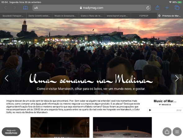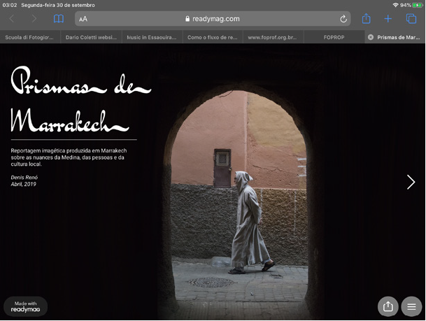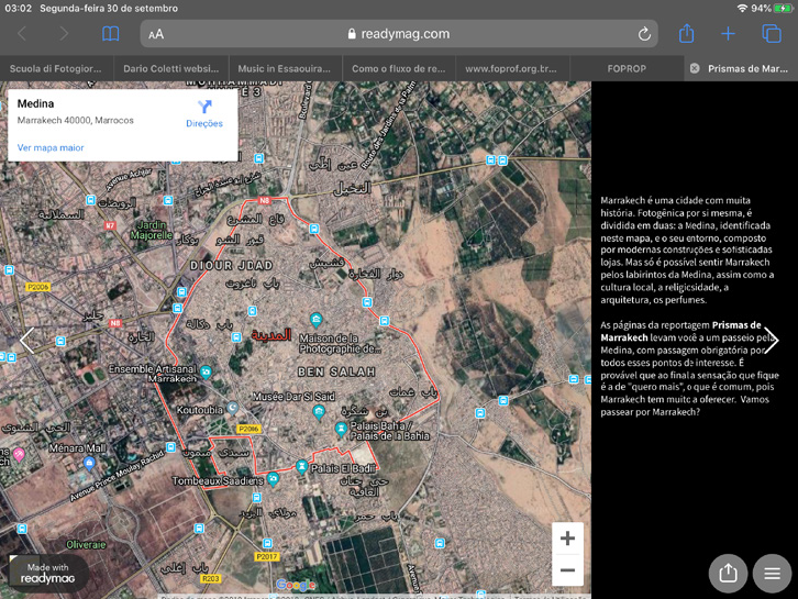 A segunda página da obra oferece um mapa interativo da Medina, a cidade murada de Marrakech, é um argumento da pós-fotorreportagem. Observa-se algo interessante nesse formato de produção, que é a semelhança a uma obra audiovisual convencional. O conceito de pós-fotorreportagem advém da pós-fotografia proposta por Fontcuberta (2016), para quem: