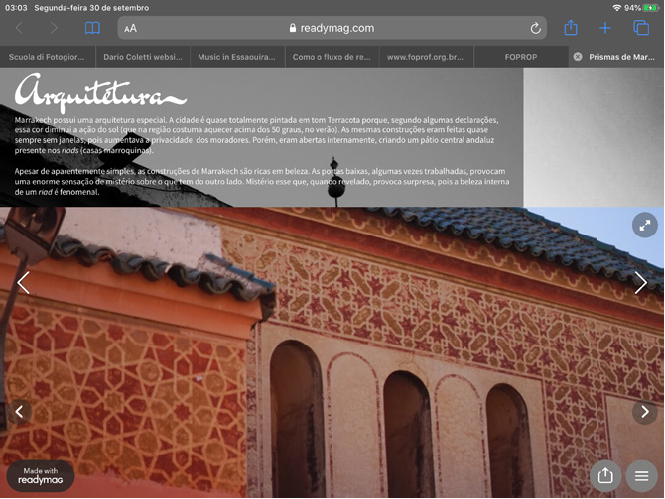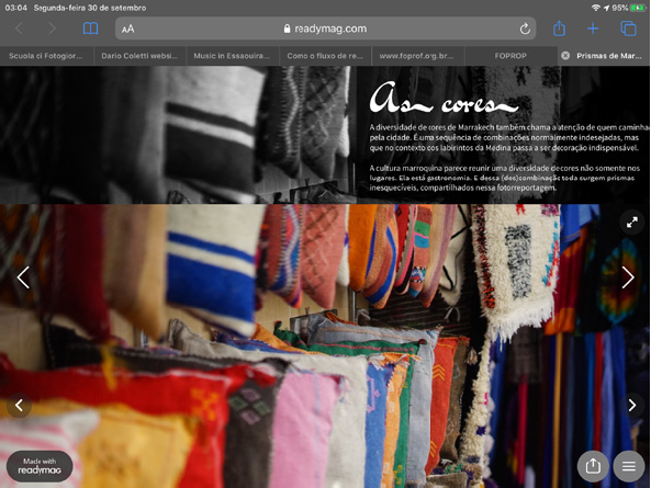 A intertextualidade, sustentada pelo dialogismo entre diversas linguagens existentes no audiovisual (imagem, som, luz, silêncio, texto, ritmo de montagem, etc), está visivelmente presente em Prismas de Marrakech, concebida quase que como uma obra audiovisual, com a narrativa passando aos olhos do usuário. A principal diferença está no fato de que o responsável pela exibição e pelo movimento da narrativa é o próprio usuário, em um visível processo de hipermediação. Isso pode ser observado desde a página 3, sobre a arquitetura de Marrakech (figura 4) até a página 8 (figura 5), onde está presente a diversidade cromática das ruas da Medina.