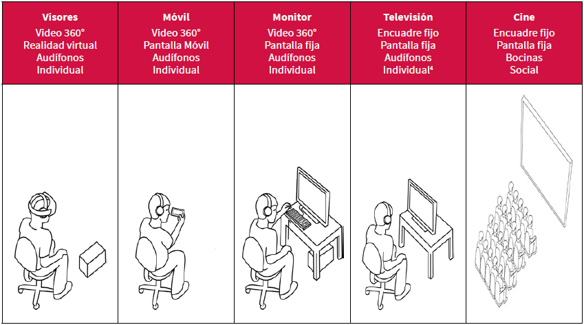 Con la intención de centrar el análisis comparativo en solo una dimensión, la visual, en los cuatro tratamientos donde la experiencia es individual, se utilizarán el mismo tipo de audífonos para la recepción del audio de la historia. Aunque el enfoque de la investigación son las diferencias entre la realidad virtual cinematográfica y el cine normal, se han incluido otros 3 tratamientos por su popularidad y por su disponibilidad. Los sujetos en el tratamiento de realidad virtual cinematográfica utilizarán visores Oculus Go y los sujetos en el tratamiento con el móvil utilizarán dispositivos Pixel 3. Servicios en línea como YouTube, Vimeo y Facebook son plataformas populares que permiten la experiencia de un vídeo esférico interactivo en una pantalla bidimensional común. Por lo tanto, la narrativa en realidad virtual cinematográfica puede verse de forma interactiva con un dispositivo celular. Durante la experiencia, el usuario puede mover la orientación del dispositivo y este mostrará, dentro de su pantalla, partes del video esférico. Mediante la utilización de los sensores en el dispositivo es posible simular que el usuario está viendo un evento como si lo estuviera filmando desde un punto fijo. Los sujetos con el monitor estarán sentados frente a una pantalla bidimensional y tendrán acceso a un teclado de computador. Previamente recibirán una breve explicación sobre cómo controlar la orientación del video esférico a través de las teclas awsd (izquierda, arriba, abajo, derecha, respectivamente).