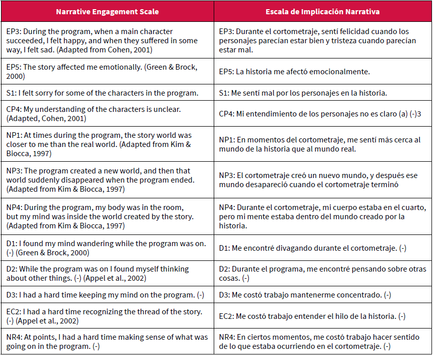 A partir de estos ítems y del concepto de Engagement o implicación narrativa, seleccionamos de la escala establecida por Busselle y Bilandzic (2009), aquellos acordes a los objetivos de la investigación recogidos anteriormente.