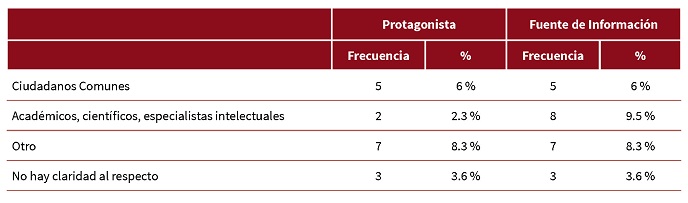 La siguiente (tabla 4) hace referencia al actor principal de la nota, esto es la persona o institución sobre quien trata principalmente la notica. Se observa claramente la tendencia de mantener como protagonista al presidente de la República, Andrés Manuel López Obrador, ya que un 53.6 % de notas giran en torno a lo que él decía sobre la rifa del avión presidencial. El resto se dividió en los diferentes actores relevantes para el sorteo. En un 9.5 % la Lotería Nacional, institución encargada del sorteo se hizo presente, el tercer lugar fue referente a otros (8.3 %), donde se incluyeron como protagonistas empresarios, banqueros, inversionistas, alguna autoridad internacional e incluso vendedores de lotería. Los miembros o representantes del Gobierno Estatal o Municipal, así como los académicos y científicos ocuparon los últimos lugares del protagonismo con 1.2 % y 2.3 %, respectivamente.