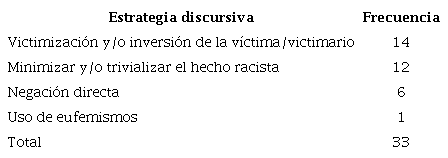 En segundo lugar, hemos evidenciado una variedad de estrategias discursivas de negación del racismo. En concreto, han sido cuatro las detectadas: la victimización y/o inversión de la víctima/victimario, el minimizar y/o trivializar el hecho racista, la negación directa y el uso de eufemismos. Estas estrategias no funcionan como categorizaciones estanco, sino que están interrelacionadas, y en algunos casos se presentan en esa interacción, como, por ejemplo, minimizar o trivializar el racismo, a través del uso de eufemismos.