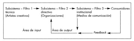 Entre las propuestas de diferentes estudiosos (como Howard Becker, Diana Crane o Wendy Griswold), aunque se enmarcan en un contexto social anterior y que habrá que actualizar a la luz de un nuevo paisaje mediático digital, a la hora de establecer y estructurar los principales pilares de la cadena de valor que describe Boni (y que se corresponden con los campos artístico, mediático y económico), nos parece válido el modelo de Paul Hirsch (1972) , el llamado “sistema de la industria cultural”. Para el autor, a través de tres “subsistemas” (técnico, directivo e institucional), la industria cultural y mediática trabaja para transformar la labor creativa de los autores en productos comerciales y previsibles.