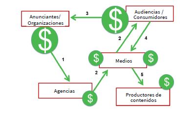 Los anunciantes (es decir, cualquier organización o marca que tenga la necesidad de promocionarse) precisan transmitir sus mensajes comerciales a sus potenciales clientes, y lo hacen invirtiendo en canales (medios de comunicación) a través de la ayuda de intermediarios: las agencias de publicidad, marketing y comunicación, que reciben unos honorarios para crear los mensajes y gestionar estratégicamente dicha inversión en medios [es el flujo económico número 1 de la figura 2].
