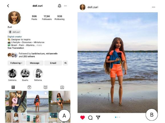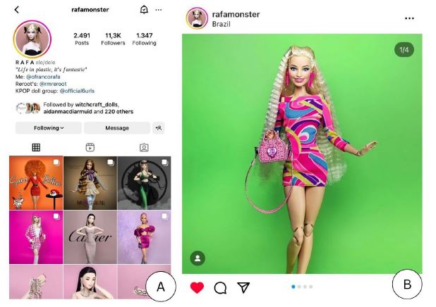 With the release of Barbie’s official Instagram profile (@barbiestyle), people of all ages felt encouraged to create pages on the online platform to share images and stories of their own dolls. Currently, this so-called doll community boasts thousands of profiles. The purpose of this study, part of an ongoing PhD research, was to explore this community and understand, through the shared images and texts, how the Barbie doll is used on Instagram. Additionally, it sought to identify constructions that reflect aspects of our own culture. To conduct this investigation in an online field, a netnographic research approach was developed, which included participant observation of 100 Instagram profiles based on the following criteria: i) public Instagram profiles using original Barbie doll images, and ii) profiles with a minimum of 50 posts and at least 1,000 followers.