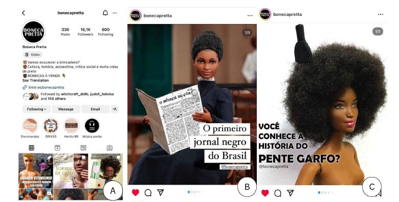 These ruptures are also found in the Instagram doll community, where 1 % of the selected profiles use Barbie images to promote discussions related to the black community. The profile @bonecapretta, for example, was created in 2017 to use dolls, particularly Barbie, to address issues related to the black community. Currently boasting over 16 000 followers and 300 posts, the profile aims to discuss day-to-day situations experienced by that community and promote Afro-Brazilian culture, history, and art (Figure 4).