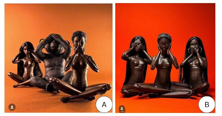 The two images were shared on the same day in August by the same profile. In the first image (Figure 5a), two black Barbie dolls share the scene with a monkey figure, in a clear recreation of the traditional Japanese proverb “see no evil, hear no evil, speak no evil”. Traditionally associated with this proverb is the image of three monkeys, which, according to Tendai Buddhist legend, represent the life cycle of man. However, in the image shared on Instagram, two monkeys are replaced by black dolls, which immediately sparked protests from various communities, both doll enthusiasts and those connected to black and Afro-descendant people. “When you see three figures with their mouths, eyes, and ears covered, you know they are monkeys”, pointed out one profile. “Your post illustrated the oldest racial stereotype that exists”, commented another.