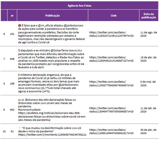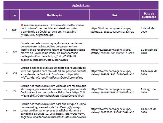 A partir dessa coleta e categorização, as checagens apresentadas pelos cinco primeiros tuítes de cada agência serviram como base para análise qualitativa. Isso significa que os tuítes apenas nos indicaram quais conteúdos das agências Lupa e Aos Fatos seriam estudados. Justificamos que, como a análise é qualitativa, a preocupação foi apenas com o número de verificações necessárias para a pesquisadora observar certos padrões e não com a quantidade delas.