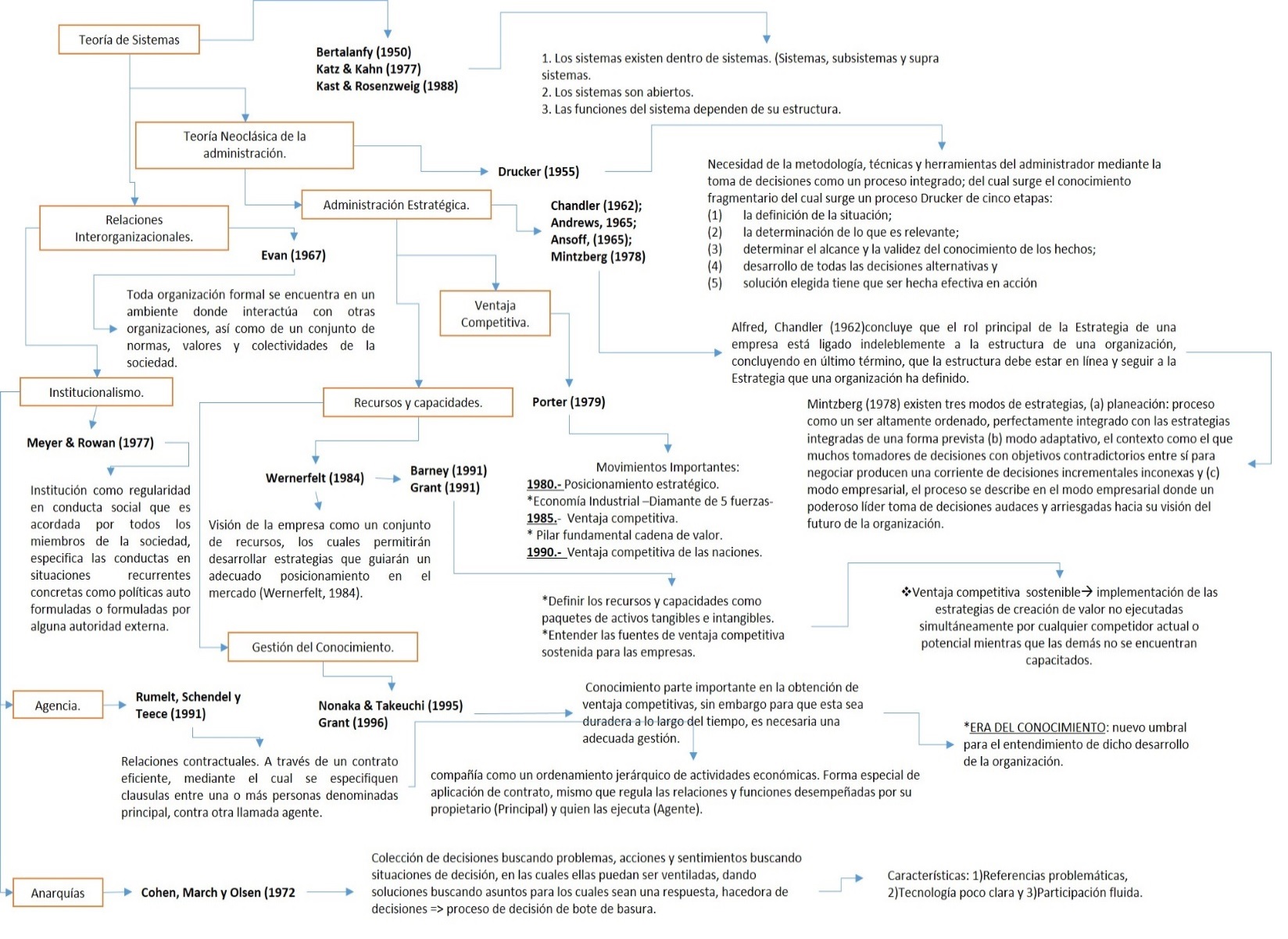 Surgen así la teoría de relaciones interorganizacionales, institucionalismo y la teoría de la agencia, que sin duda alguna son vistas como sistemas abiertos que comparten y reciben información tanto interna y externa. Sin embargo, cada una difiere en la forma de ver la organización en conjunto, así mismo se enfocan en diferentes sectores y áreas.