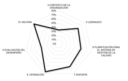 Los resultados consolidados por capítulos en relación al cumplimiento de los requisitos de las normas se presentan en la Figura 1. La organización exhibe un alto porcentaje de cumplimiento frente a los requisitos operacionales definidos en el Capítulo 8 de las normas ISO y requisitos de mejora descritos en el Capítulo 10, con porcentajes de cumplimiento alrededor del 80%, y porcentajes bajos de cumplimiento frente a los requisitos relacionados con el contexto de la organización (Capítulo 4) y evaluación del desempeño (Capitulo 9).
