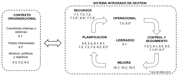 La metodología para la implementación del sistema integrado de gestión se basa en un modelo construido bajo el enfoque sistémico de procesos y basado en la estructura de alto nivel y el ciclo PHVA. El modelo se encuentra estructurado en dos etapas, una primera etapa denominada contexto organizacional y una segunda etapa sistema integrado de gestión, como se observa en la Figura 2. Cada uno de los componentes del modelo tiene asociado el o los requisitos comunes de las normas ISO 9001 e ISO 14001 versión 2015, los cuales, aunque difieren en su naturaleza y función, pueden ser integrados por elementos y requisitos específicos.