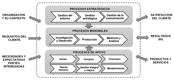 La primera actividad durante el proceso de planificación del SIG de la calidad y medio ambiente bajo el enfoque sistémico es determinar los procesos y sus interacciones. La organización define la estructura de sus procesos, las entradas y salidas, así como las responsabilidades y los recursos (Alonso-Torres, 2014). Según Hernández Nariño, Medina León y Nogueira Rivera (2009), los diagramas o mapas de procesos son los métodos visuales más utilizados para representar la estructura de los procesos con el fin de conocer, comprender y, por consiguiente, mejorar la organización dándole valor agregado. De acuerdo al núcleo de las actividades de la organización y sus interrelaciones, se establece el mapa de procesos que se presenta en la Figura 3; el mapa se encuentra estructurado en tres niveles: estratégicos, misionales y de apoyo.