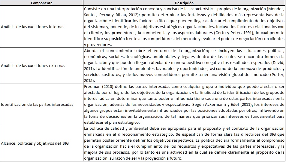 La primera etapa, contexto organizacional, involucra cuatro componentes claves: (1) análisis de cuestiones internas, (2) análisis de cuestiones externas, (3) identificación de las partes interesadas y sus requisitos o necesidades, y (4) definición del alcance, política y objetivos del SIG, los cuales se describen en la Tabla 1.