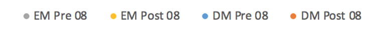 As discussed before, there seems to be a structural break in the series for derivatives turnover after 2007. We build two time series in order to cope with this possible structural break: “Pre 2008” (1995, 1998, 2001, 2004, 2007) and “Post 2008” (2010, 2013). We also divide the data according to the country development and risk status: Developed (DM) and Emerging markets (EM)[5]. As a result, four different groups are available for a total of 277 observations . Finally, to study the three transmission channels stated and defined in Section 2, we compute and interpret the correlation between derivative turnover and GDP ratios with other economic variables that are representative of each channel/sub-channel on a yearly and cross-section basis.