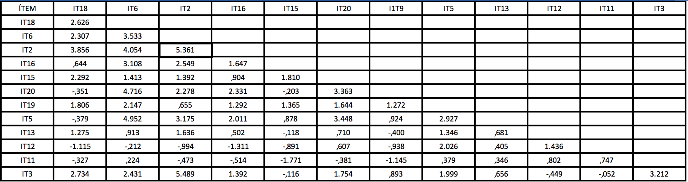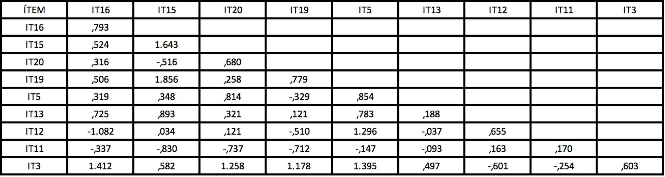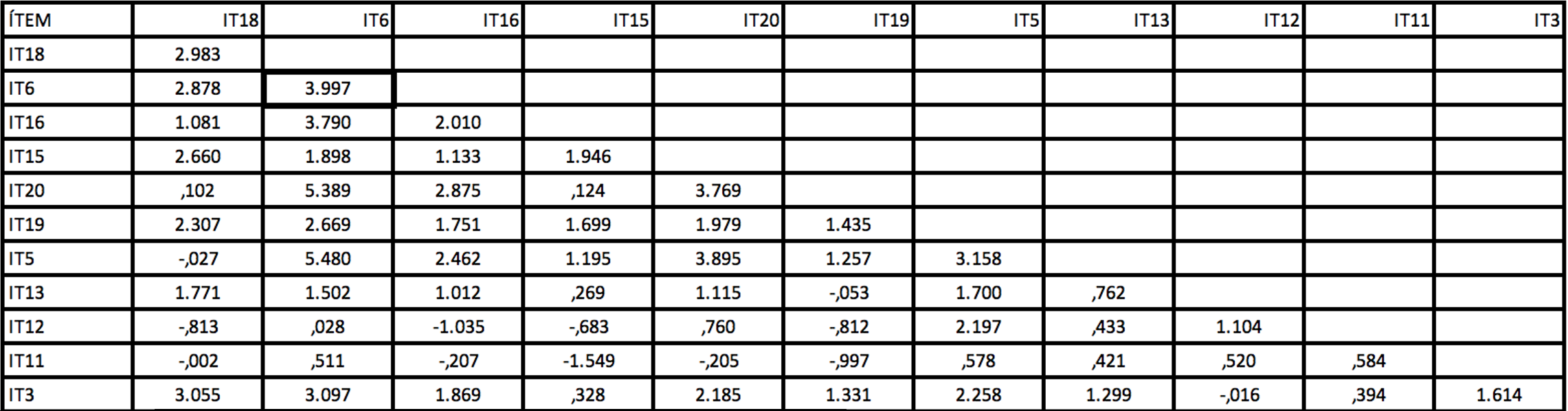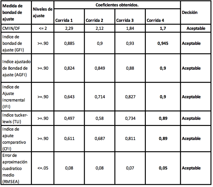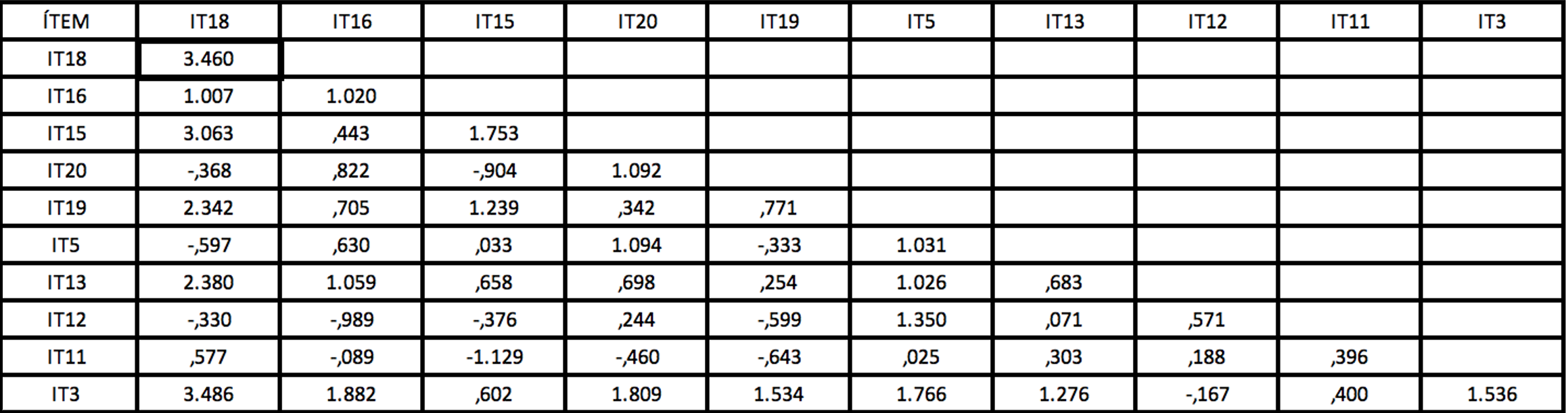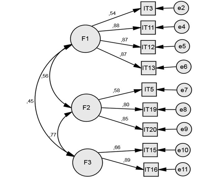Como criterios estadísticos para obtener el modelo final, se pueden observar en la Tabla 6 donde la mayoría de los criterios son muy bajos en la primera corrida de ajuste y no se encuentran en el nivel de aceptación; sin embargo, se realizan las siguientes 3 corridas de ajuste hasta que las medidas de bondad se consideran aceptables. También se analizaron las covarianzas de los residuos estandarizados con el criterio de que todos los Ítems deben tener valores menores de 2,58; si no es así, se elimina el Ítem. Con el propósito de un mejor ajuste del modelo, se realizaron 4 corridas de ajuste, eliminando el ítem con mayor coeficiente en el análisis de las covarianzas de los residuos estandarizados; se puede observar en la Tabla 7 que el IT2 es el de mayor coeficiente por lo que se elimina; en las Tablas 8 y 9, los Ítems IT6 y el Ítem 18 respectivamente presentan coeficientes mayores a 2,58 y también se eliminan, quedando 9 ítems que tienen coeficientes aceptables por debajo de 2,58 (ver Tabla 10), así como las medidas de bondad de ajuste, que determinan el grado en que el modelo podría ser generalizable cumpliendo con los umbrales propuestos por Hair et al. (2010).