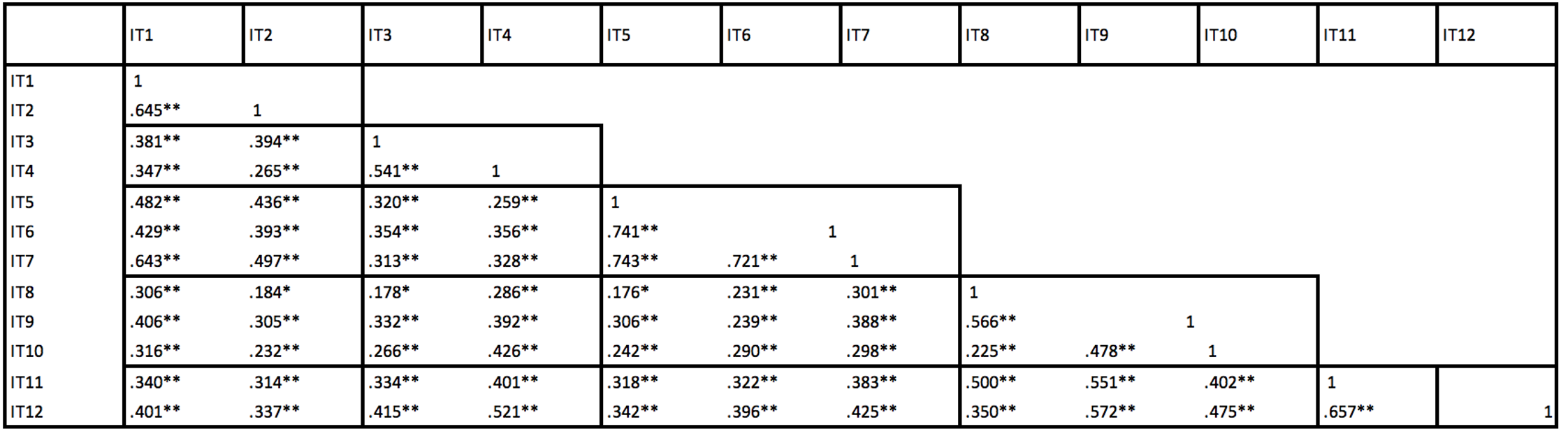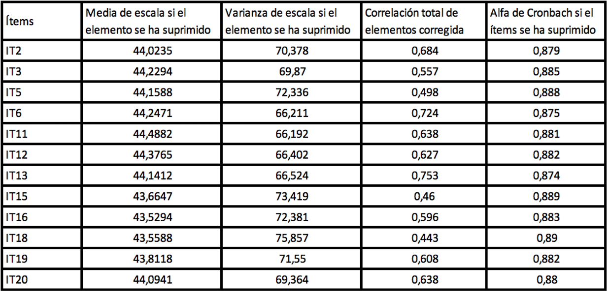 Se determinó la validez convergente y divergente. La primera, entendida como la correlación positiva entre las pruebas consideradas, lo que indica que ambas pruebas reclutan el mismo proceso. Y la segunda, entendida como la ausencia de correlaciones estadísticas entre las puntuaciones de las pruebas, lo que indica que las pruebas en cuestión no involucran los mismos procesos (Hogan, 2004). Para determinar la validación de la escala se realizó mediante la validez convergente que valora el grado en el cual dos medidas del mismo concepto están correlacionadas entre sí y representan con precisión el concepto de interés, en este proceso se eliminaron 8 ítems con coeficientes correlación bajos, quedando el análisis con 12 ítems como se muestra en la Tabla 1.