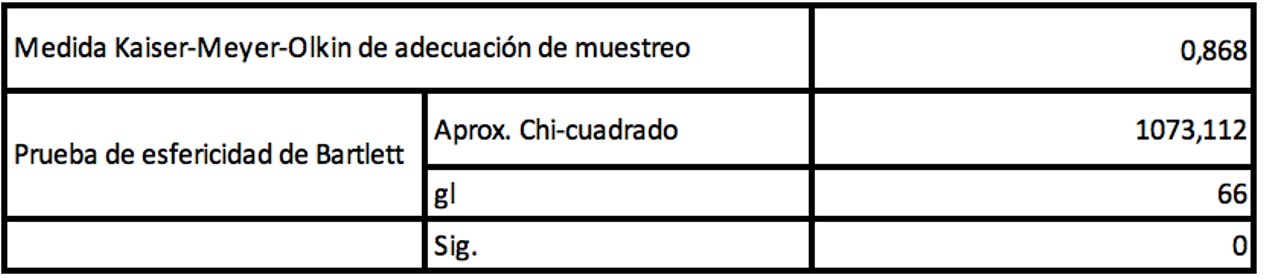 Se analizó la medida de suficiencia de muestreo (MAS) como medida para cuantificar el grado de interrelaciones entre las variables y la conveniencia del análisis factorial, que puede ser interpretada con las siguientes directrices ,80 superior ,70 regular y ,60 mediocre. También se tomó en cuenta el contraste de esfericidad de Bartlett que muestra la significación general de todas las correlaciones que para ser válido debe tener un nivel < ,005 (Hair et al., 2010). Para la presente investigación la MAS fue ,868 que se considera superior y significativa a un nivel de ,000 (ver Tabla 3).