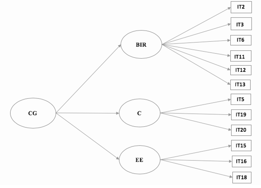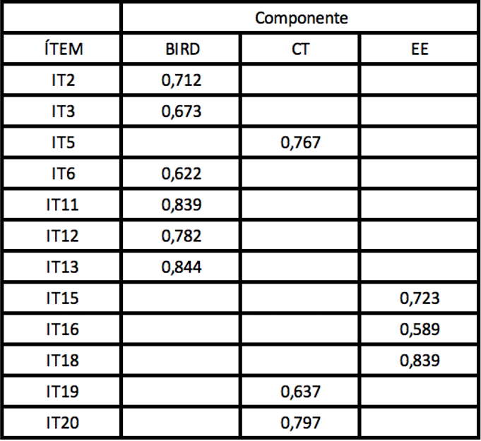 Como se muestra en la Tabla 5, los 12 ítems que se encuentran dentro de los niveles indicados se agruparon en 3 factores; 6 para el componente 1 (BIRD), 3 para el componente 2 (CT) y 3 para el componente 3 (EE). En relación con los constructos teóricos hubo una reducción como producto del AFE de 4 constructos que miden la comunicación interna a 3 (Retroalimentación sobre el desempeño, Contribución y Espíritu de equipo) quedando al final con 12 ítems de los 20 originales (ver Figura 2).