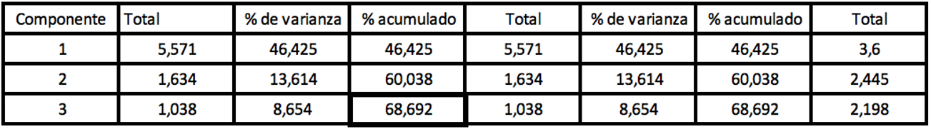 Posteriormente se llevó a cabo el análisis de componentes principales que muestra el porcentaje de varianza extraída mayor a 60% que en las ciencias sociales se considera como satisfactoria (Hair et al., 2010). El presente estudio muestra que el 68,69% es explicado por 3 componentes, con autovalores de 1 (ver Tabla 4).