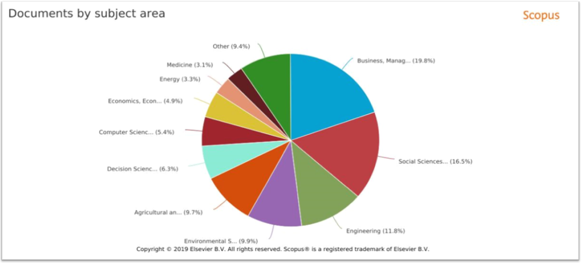Las áreas de investigación más productivas en el campo de la temática tratada en este documento son: gerencia y negocios, ciencias sociales, e ingeniería. La Figura 2 muestra una distribución porcentual de estas y otras áreas de investigación en el espectro de las prácticas de sistema de gestión de costo como un óptimo empresarial.