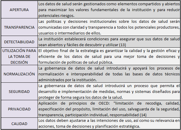 D’Agostino et al. (2017) postulan los elementos que entienden más relevantes para lograr una estrategia efectiva en la gobernanza de datos abiertos de salud, planteando un cambio de paradigma en los sistemas informáticos. Para lograr una política efectiva en la gestión de la información son imprescindibles al menos un programa de alfabetización digital, conjuntos de normas y procedimientos estandarizados, directorio de datos de salud, taxonomía y glosario institucional y un esquema de permisos sobre los datos (Tabla 1).