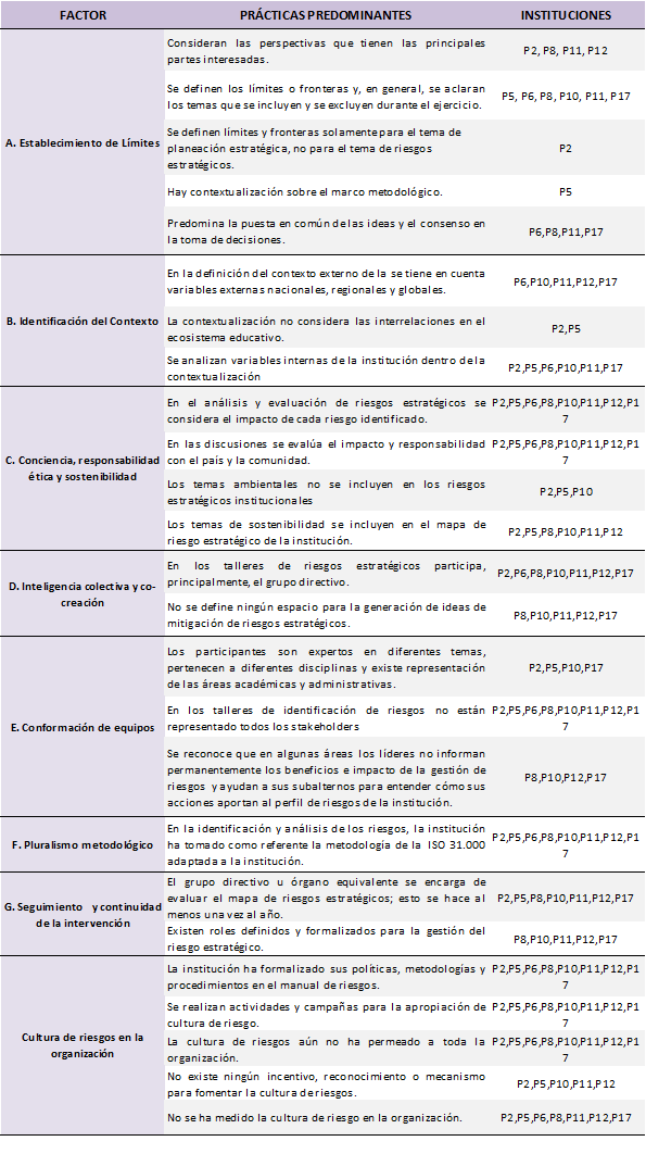 Gran parte de las universidades estudiadas definen los límites o fronteras y, en general, aclaran los temas que se incluyen y se excluyen durante la identificación y evaluación de los riesgos estratégicos. Sin embargo, muchos de los límites y fronteras se establecen en la planeación estratégica donde se realizan análisis de contexto tanto interno como externo, se identifican debilidades, oportunidades, fortalezas y amenazas institucionales y, a partir de esto, se determinan los temas que serán incluidos y los que no dentro de las definiciones estratégicas y objetivos estratégicos. Estos resultados son comparables con los obtenidos en dos estudios realizados sobre riesgos estratégicos a grandes empresas privadas de Antioquia, Colombia, donde se concluye que la gestión de riesgos se realiza a partir de la definición de la estrategia y objetivos estratégicos planteados en la organización (Jaraba et al., 2018; Palacio Giraldo y Nuñez, 2020).