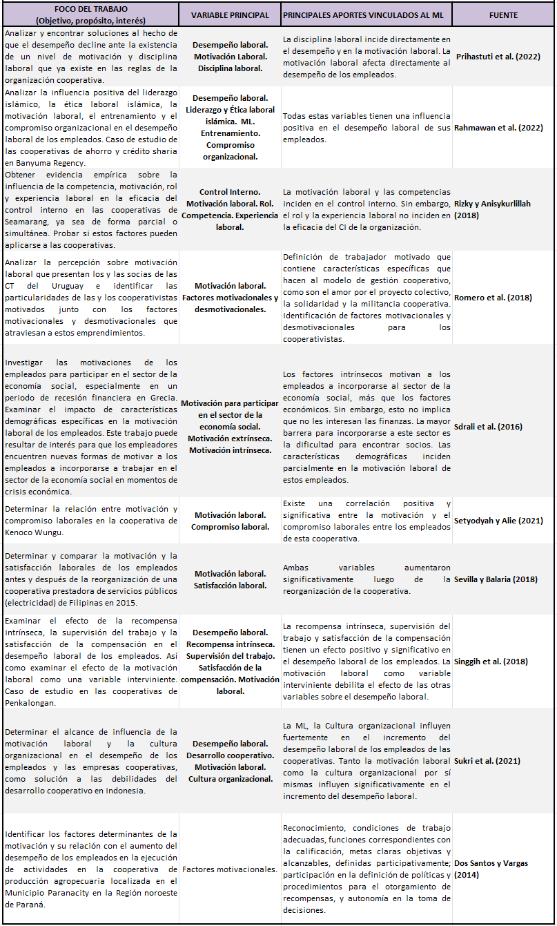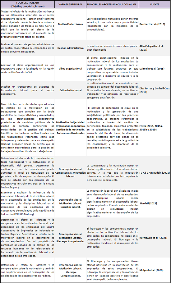 En cuanto a los principales aportes sobre motivación laboral en el sector cooperativo que se desprenden de los documentos analizados, cabe resaltar que en las cooperativas italianas los trabajadores y las trabajadoras motivados y motivadas perciben mayores salarios, asociado a su mejor productividad (Becchetti et al., 2013), lo que se relaciona con la verificación que hacen diferentes autores sobre la correlación positiva que hay entre motivación laboral y desempeño en los empleados de las cooperativas (Alba Caluguillin et al., 2017; Prihastuti et al., 2022; Rahmawan et al., 2022; Sukri et al., 2021).