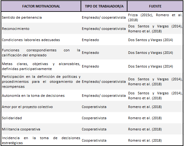 Así, en su investigación sobre cooperativas de servicios públicos de la ciudad de Córdoba-Argentina, identifica como factor clave el sentido de pertenencia y propone profundizar en este aspecto para reformular la motivación tomando “elementos presentes en la subjetividad de los trabajadores: ausencia del fin de lucro; la dimensión social prestando servicios donde no es rentable, contribuyendo así a la igualdad de los ciudadanos; y la valoración de la propiedad colectiva” (p. 82). Dos Santos y Vargas (2014) por su parte identifican el reconocimiento, las condiciones de trabajo adecuadas, funciones correspondientes con la calificación del empleado, metas claras, objetivas y alcanzables, definidas participativamente, la participación en la definición de políticas y procedimientos para el otorgamiento de recompensas y autonomía en la toma de decisiones, como factores que inciden en la motivación de los empleados de una cooperativa de producción agropecuaria de Paranacity- Brasil. Y en un estudio focalizado en los trabajadores y las trabajadoras cooperativistas, Romero et al. (2018) identifican factores motivacionales propios del modelo de gestión cooperativo en su estudio para las cooperativas de trabajo de Montevideo- Uruguay: el amor por el proyecto colectivo, la solidaridad y la militancia cooperativa.