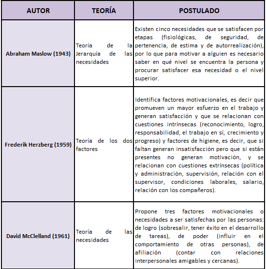 Sin embargo, a los efectos de enmarcar conceptualmente este trabajo, y siguiendo a Robbins y Judge (2017), se identifican tres teorías clásicas sobre motivación que surgen en la década de 1950 con foco en las necesidades de los individuos y, según los autores, son quizás las más conocidas. Estas se muestran en la Tabla 2.