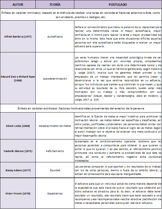 Otro grupo de teorías lo constituyen las teorías contemporáneas de la motivación, nombradas así debido a que “representan las ideas que actualmente tratan de explicar la motivación de los trabajadores” (Robbins y Judge, 2017, p. 214), tal como se muestra en la Tabla 3.