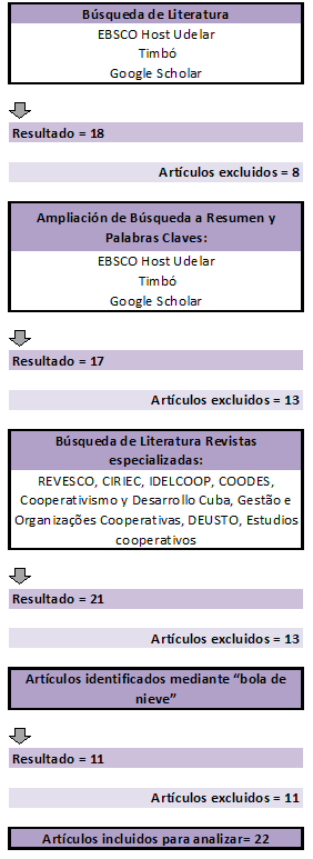 Dada la baja cantidad de documentos, se definió aceptar aquellos artículos que se referían a cooperativas (no exclusivamente de trabajo) y ampliar la búsqueda a revistas digitales especializadas en cooperativismo indexadas en Latindex. De esta búsqueda, se encontraron: