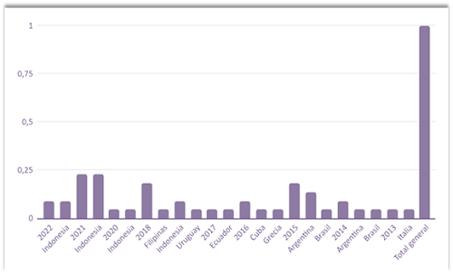 Es importante aclarar que 4 de los 7 artículos en español corresponden a un mismo autor y a una misma investigación llevada a cabo en Argentina, que fuera publicada en cuatro etapas en la misma revista entre 2014 y 2015. Esto hace que casi la mitad de las investigaciones se hayan realizado en Indonesia en los últimos años (9 investigaciones de un total de 19, publicadas entre 2018 y 2022).