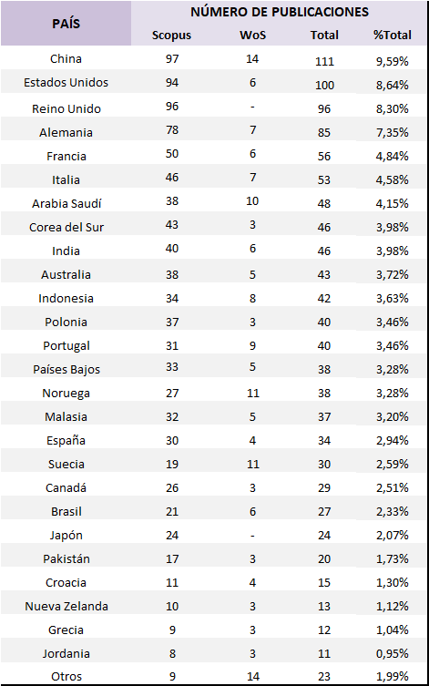 En la Tabla 4 se puede observar el ranking de los países que aportan con mayores publicaciones. Se identifica a China como el país que lidera la lista con 9,59% del número total de publicaciones, seguidamente EE. UU. con el 8,64% y en tercer puesto está Reino Unido con 8,30%. Europa es el continente que más aporta al campo de estudio con el 48,05% del total, seguido de Asia y América, siendo los tres continentes que más influyen en este ámbito de estudio.